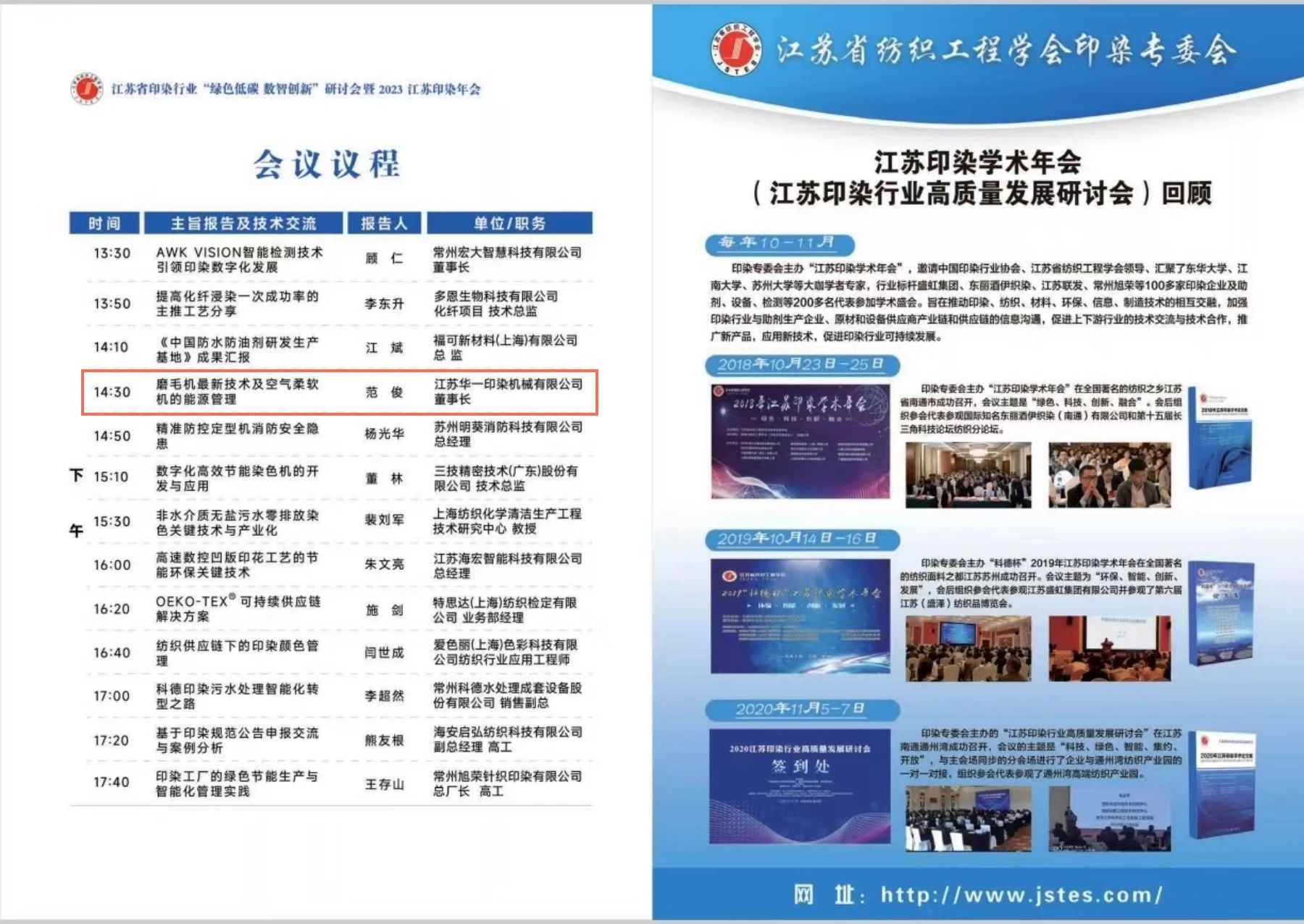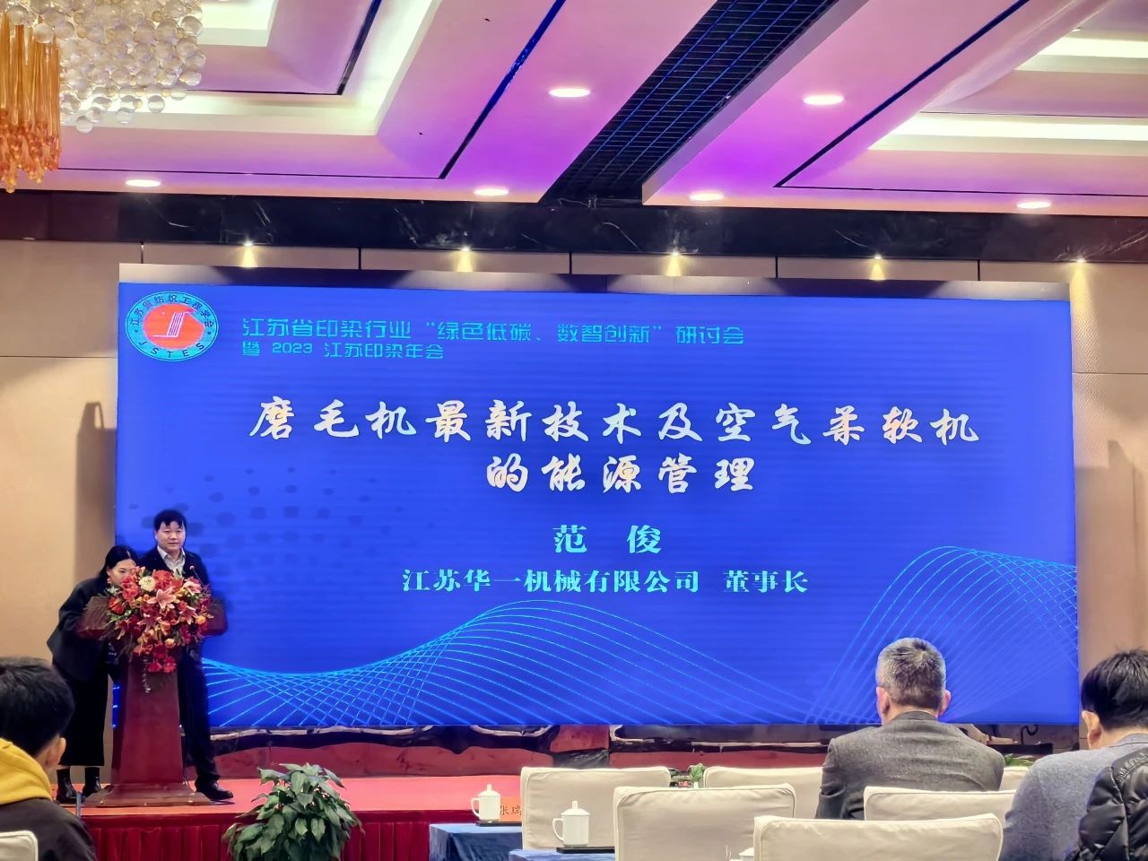 Fan Jun ประธานบริษัท Jiangsu Huayi Machinery Co., Ltd. ได้รับเชิญจากสมาคมให้เข้าร่วมการประชุมและกล่าวปาฐกถาพิเศษในหัวข้อ "Sueding Machine Technology and Air Softening Machine Energy Management"